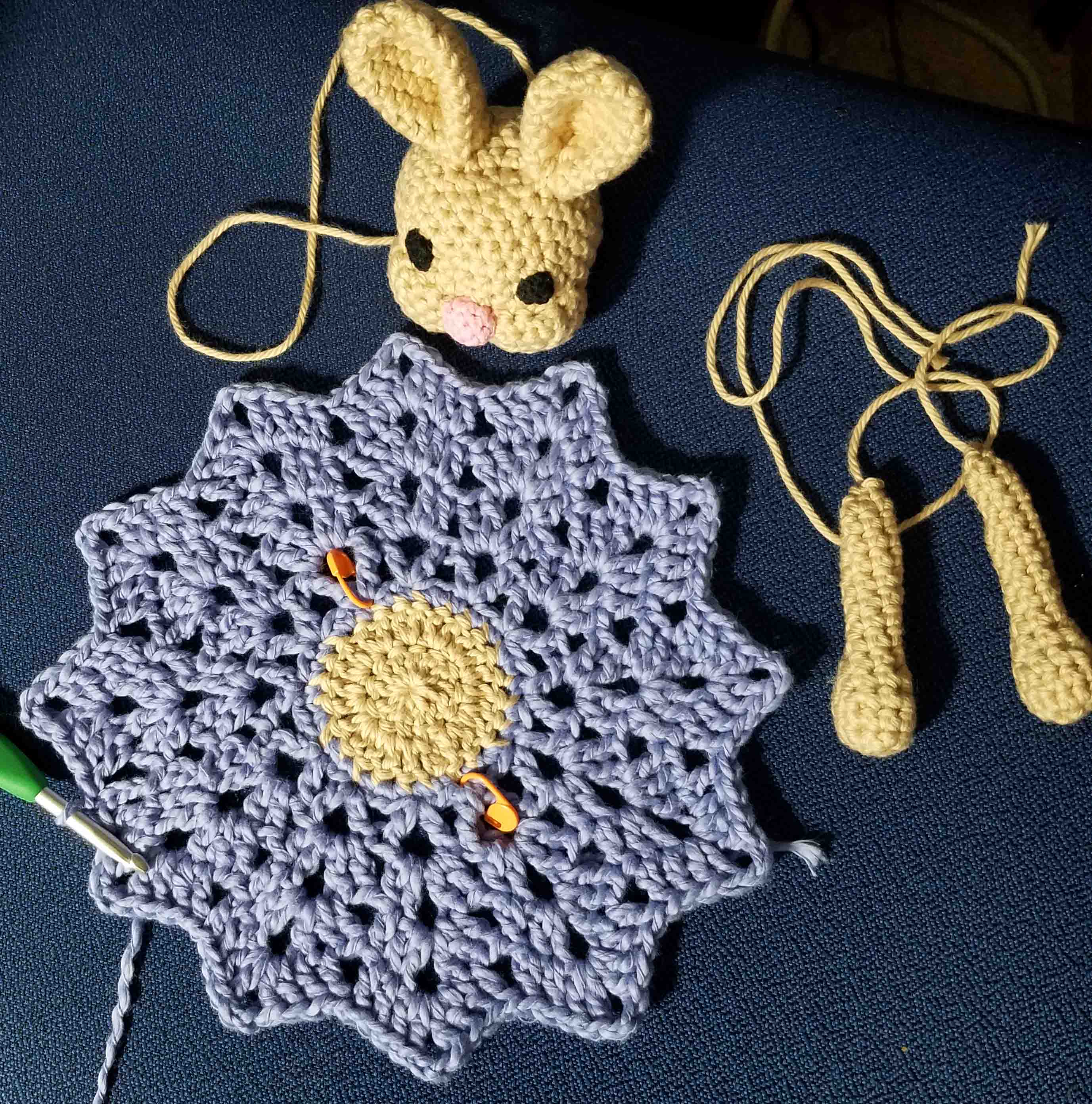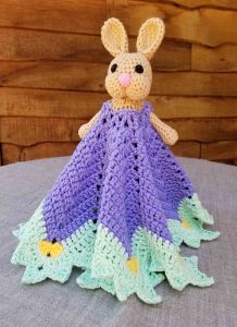 Once I had the head finished I knew I didn’t want the typical attachment to the blanket. I had picked a circular center out stitch for the blanket so that it would give the look of a dress on the bunny. I crocheted the first 2 rounds in the same yarn as the head and arms, then switched to the soft purple Cottontots for the major part of the blanket.