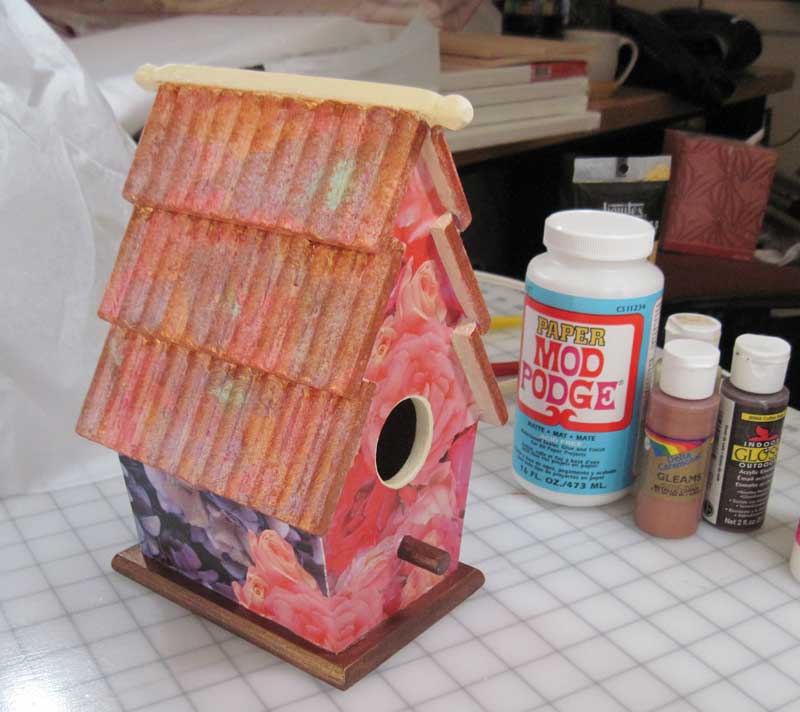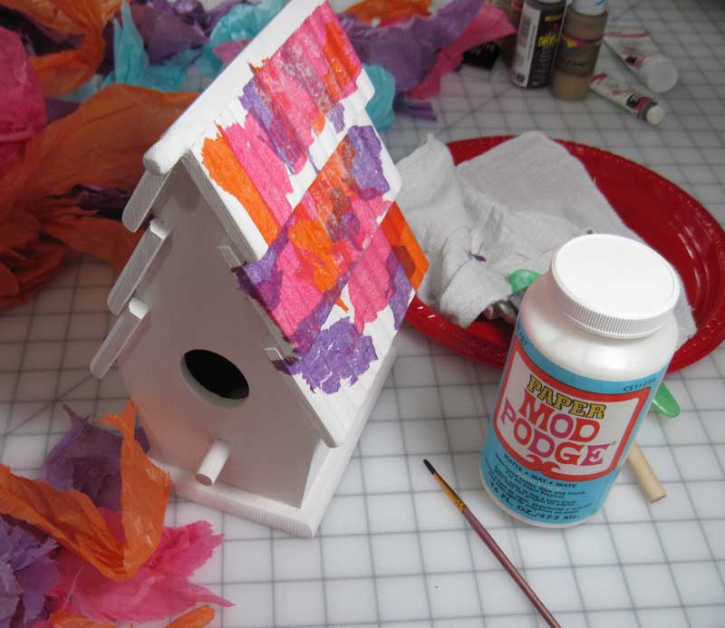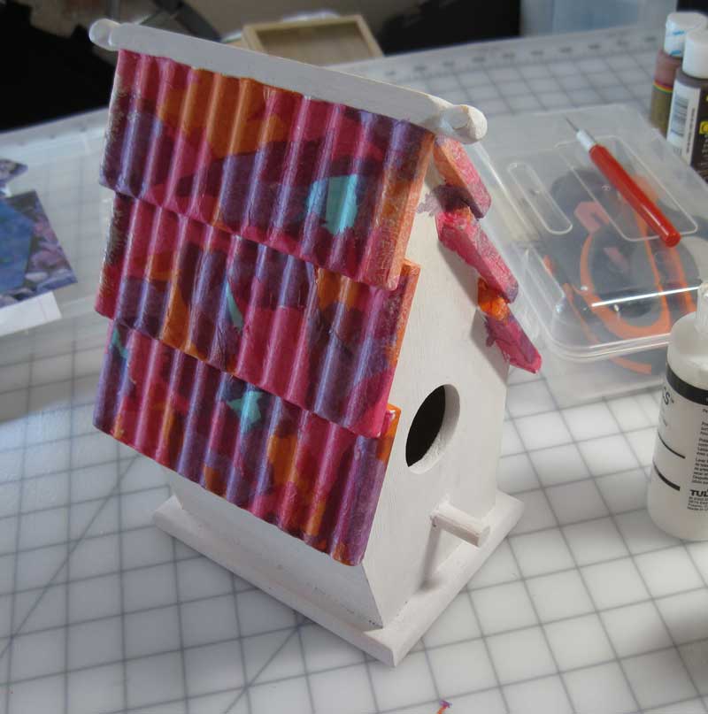 Then I used decoupage gel medium to collage the roof of the birdhouse with various colors of tissue paper.