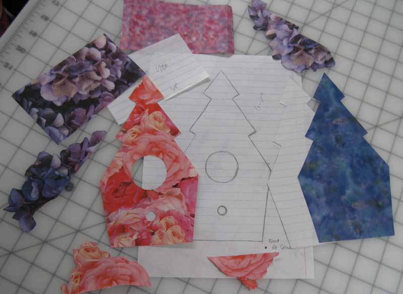First I created pattern pieces from thin notepaper to use for cutting out the fitted pieces of scrap booking paper that would be the base for the collage on the front, back and sides of the birdhouse.