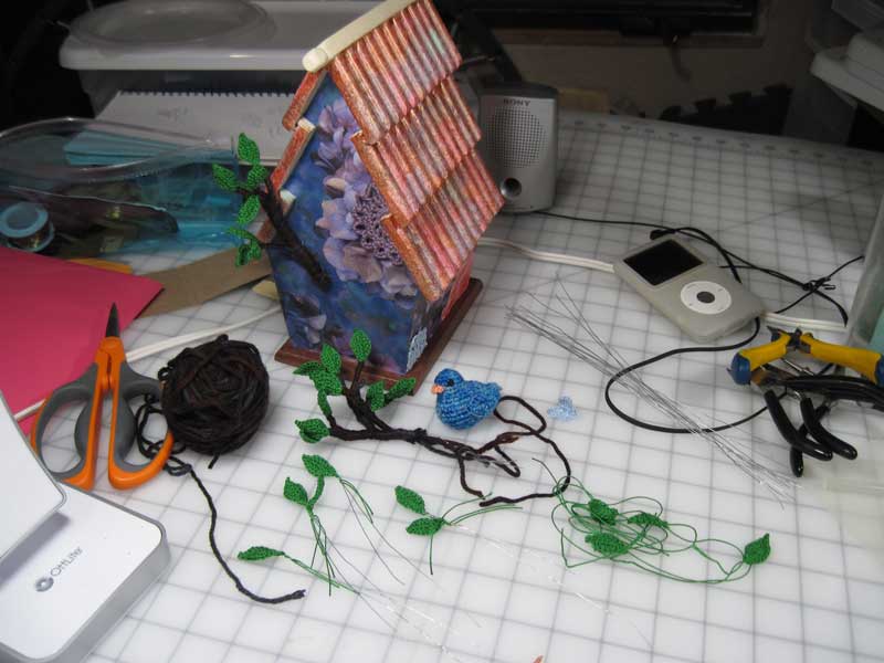 My bird house art project is finished. I worked this piece as a dimensional collage using scrap paper, colored tissue paper, acrylic paint, crocheted elements and wrapped wire sculptural pieces.