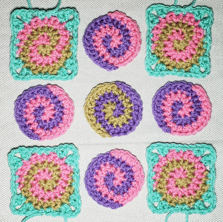Sample 3 uses color changes on each bobble stitch round to create additional texture and really makes the hearts pop out. When I worked with the 2 colors in the center heart square I didn’t cut my yarn between color changes. Instead I pulled a loop of the next color up through the slip stitch that joined the previous color. I tightened the slip stitch, then pulled up a long loop of the previous color and put a locking stitch marker in it to keep the loop from being lost. After working the new color round I used the same method to switch back to my previous color. There is a little “holding your mouth just right” with this method, but it is well worth saving yourself having to weave in a bunch of ends when you finish the square.