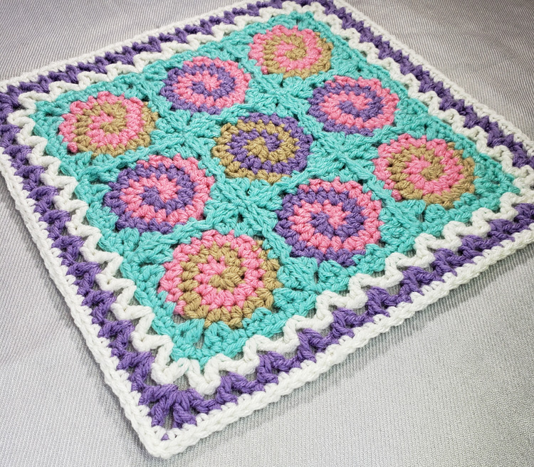 I have my annual afghan square pattern for you all to enjoy in celebration of my birthday. It is also Square #21 of the 2021 Moogly Afghan CAL. This is the “Touch of Love Afghan Square” and I’ve shown it in the above photo in 3 different color styles. The pattern does not include instructions on changing colors, I’ve left that decision to you. I have included information on how much yarn of each color I needed for the 3 samples I made.