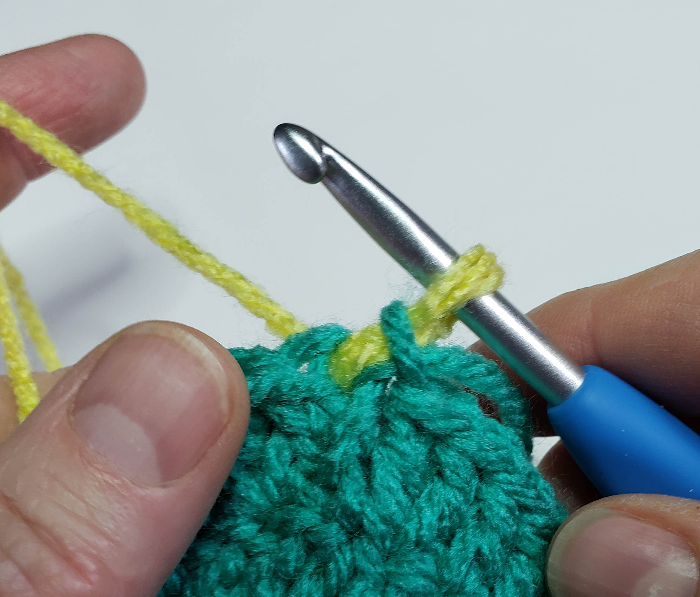 (sl st) Joining slip st: Insert hook in indicated place, YO, pull up a loop thru place and loop on hook, continue to pull up on working loop until original loop is tight.
