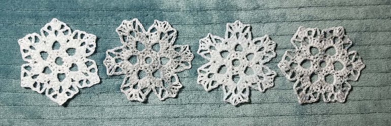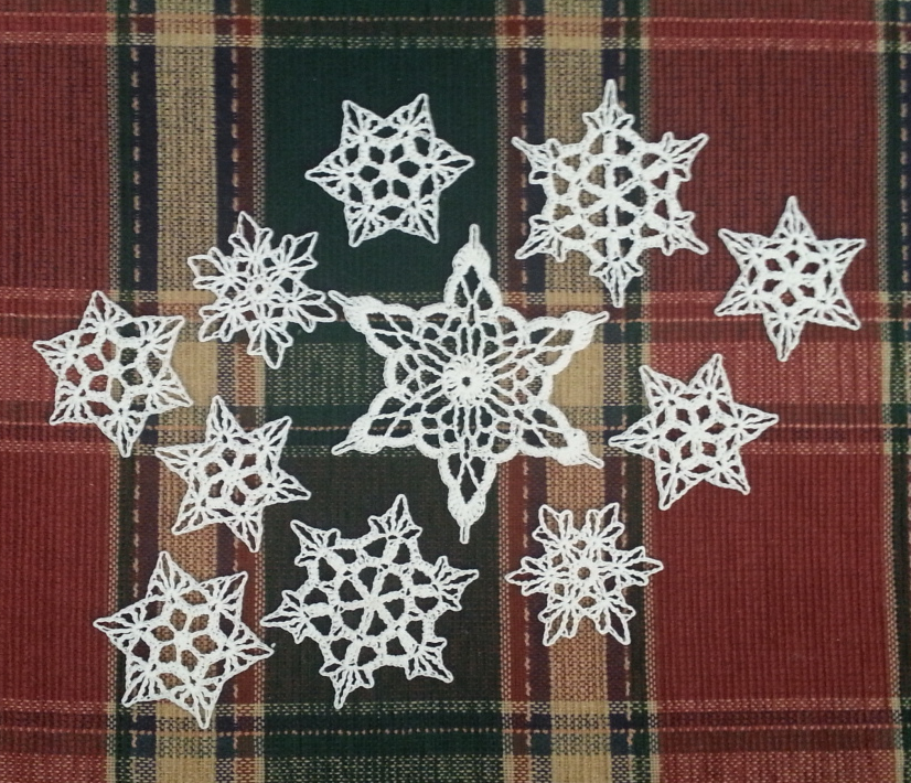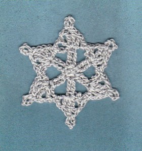 Snowflakes are one of my first choices for a fast gift. They are easy to ship and make great embellishments. You can work them in thread and stiffen them or attach the points to a larger ring for a beautiful addition to any holiday décor. I’ve also worked them in yarn and used them to embellish commercially made hats, scarves or gloves for a personalized gift.