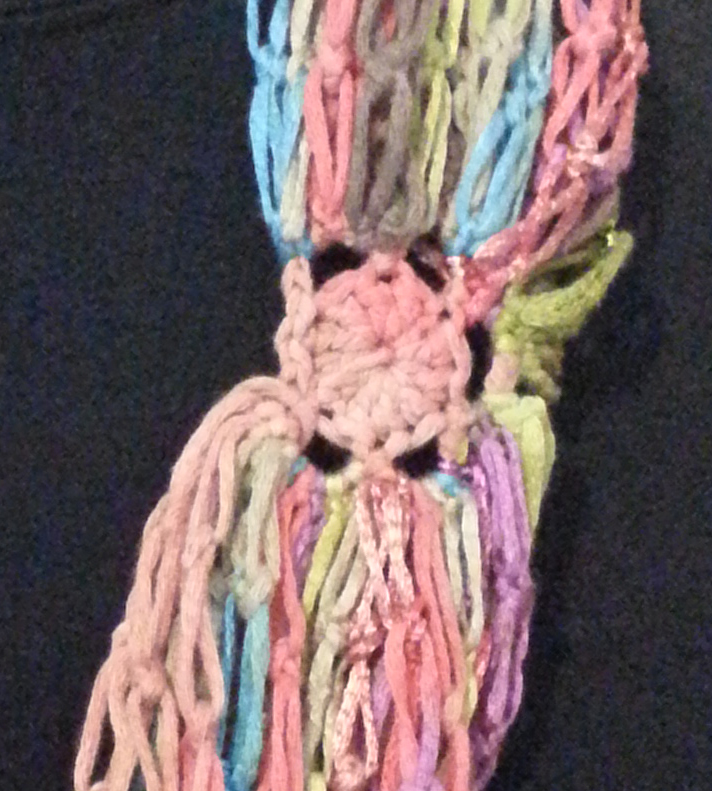 This necklace is worked by crocheting long Love Knot strands off a foundation motif. Each strand is attached at its beginning and end as it is worked.